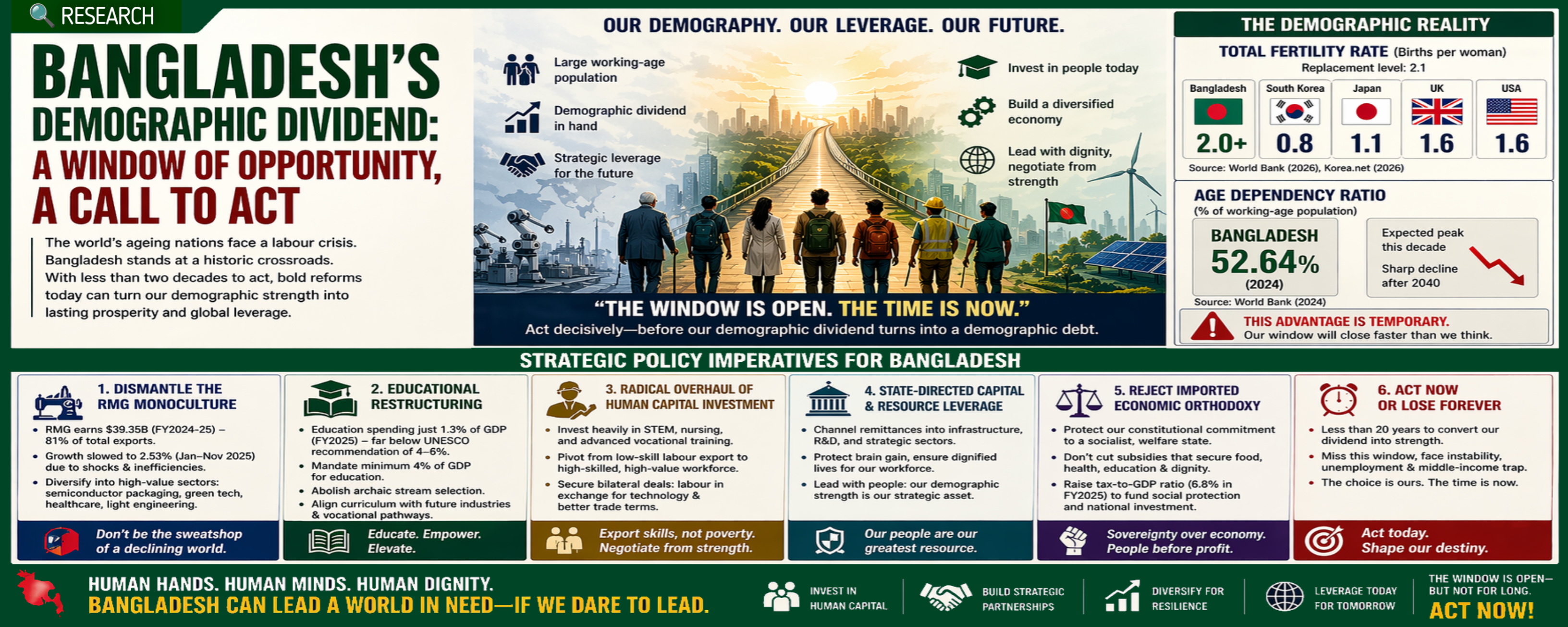 AI-driven techno-optimism has failed to resolve the demographic crisis in ageing developed economies, where human labor remains indispensable. Bangladesh’s large working-age population offers a brief strategic advantage in a world facing labor shortages. Without urgent reforms in education, diversification, and human capital, this demographic window will close, leaving the country trapped in structural dependency.