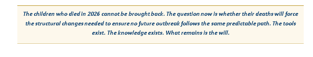 However, the intervention came after substantial and avoidable loss of life. More than 150 suspected measles deaths had already been reported, the vast majority among young children. Surveillance data from 2025 had already signalled a looming crisis as coverage declined sharply and immunity gaps widened. In a robustly governed system, corrective action — including targeted campaigns, catch-up activities, and supply-chain strengthening — would have been deployed months earlier.