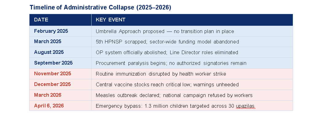 The 2026 measles outbreak in Bangladesh was a predictable outcome of administrative negligence, governance gaps, and underinvestment in system resilience. A system that had safeguarded children for more than a generation was dismantled without a viable replacement. Funding was frozen or delayed, health workers were demoralized and underpaid, and technical authority was diffused to the point of paralysis.