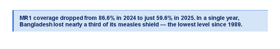 The impact on measles immunization was swift and severe. MR1 coverage fell from 86.6 percent in 2024 to about 59.6 percent in 2025, erasing nearly one-third of the country's measles protection in a single year. Bangladesh was pushed back to coverage levels last seen in the late 1980s, with predictable epidemiological consequences.