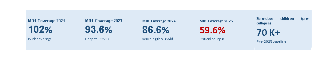 Key coverage indicators illustrate the scale of the collapse: MR1 coverage peaked at around 102 percent in 2017–2018, remained 93.6 percent in 2022 despite the COVID-19 pandemic, and then declined to 86.6 percent in 2024, reaching a warning threshold. In 2025, coverage plunged to approximately 59–60 percent, the lowest level since 1989 and far below the 95 percent threshold required to maintain herd immunity. Even before this collapse, more than 70,000 children were estimated to be "zero-dose" for routine immunization.