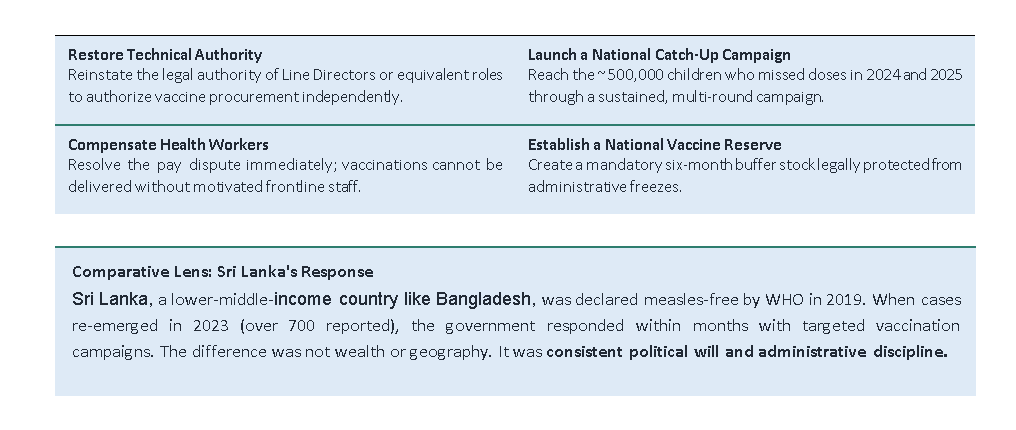 Emergency campaigns, by design, treat the symptoms of system failure rather than its causes. While the April 2026 campaign likely averted further deaths and helped reduce transmission, it did not resolve the underlying administrative vacuum. The Umbrella Approach remains only partially operational, and a permanent, legally grounded mechanism for vaccine procurement and delivery has yet to be fully restored. Without such structural corrections, future outbreaks are not a question of "if" but "when."
