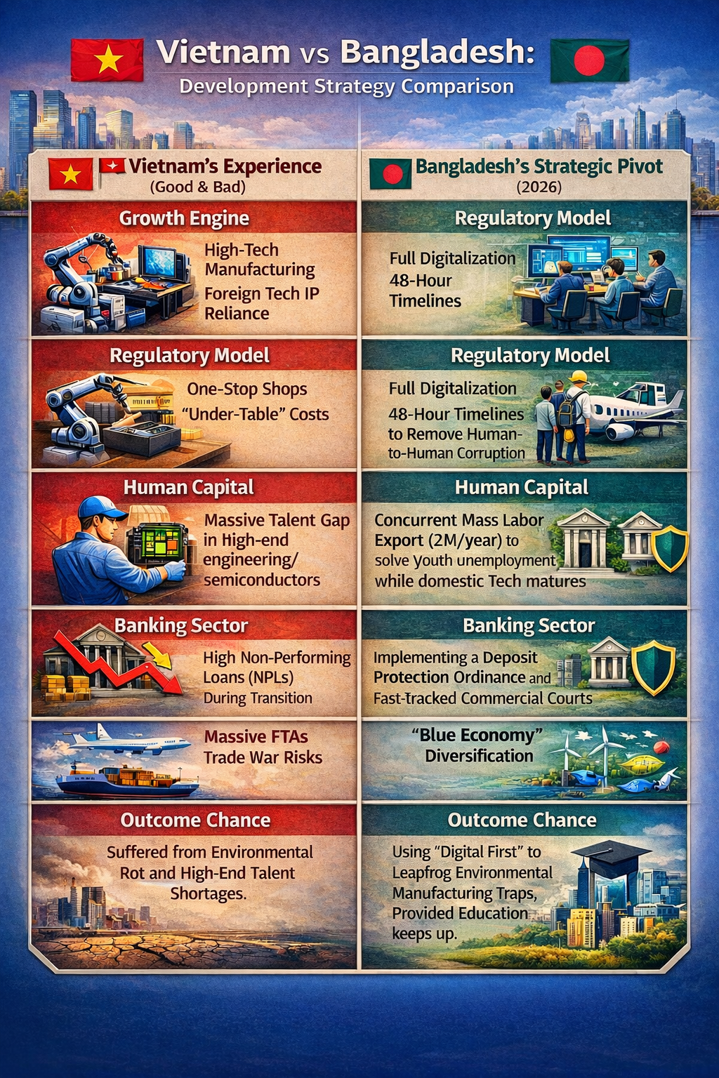 Bangladesh faces a significant risk of suffering from these same "aftermath" symptoms, particularly the talent mismatch. If the government targets 10 lakh ICT jobs without a commensurate overhaul of the vocational education system, it risks creating a "quantity over quality" bubble. However, Bangladesh’s 2026 plan incorporates a unique "Remittance Hedge" of sending 20 lakh workers abroad annually, which provides a fiscal cushion that Vietnam lacked during its early stages. This allows Bangladesh to maintain macro-stability even if domestic industrialization faces a talent bottleneck.